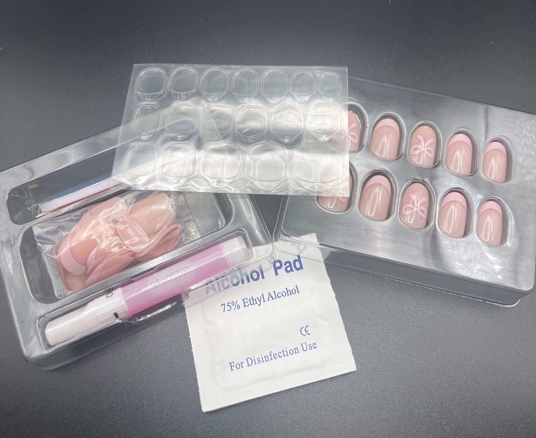 Includes: 32 nails in 16 sizes, nail glue, stick-on adhesive tabs, nail file, cuticle stick, alcohol prep wipe