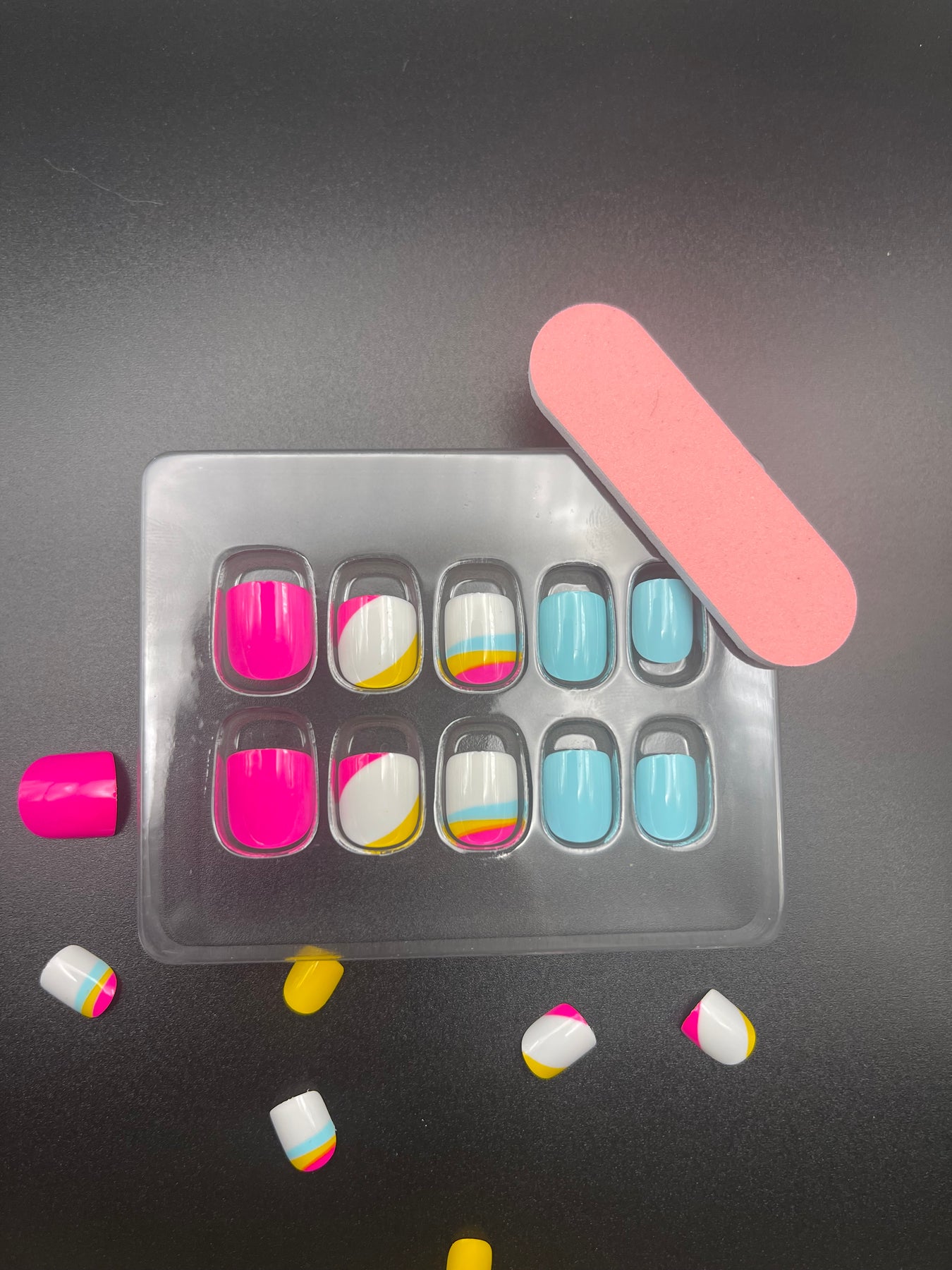 Vibrant geometric stripes that capture joy and creativity. Perfect for younger daughters, tweens who prefer smaller nail sizes, or anyone who loves playful color. Coordinates beautifully with mom’s professional styles from our main collection.